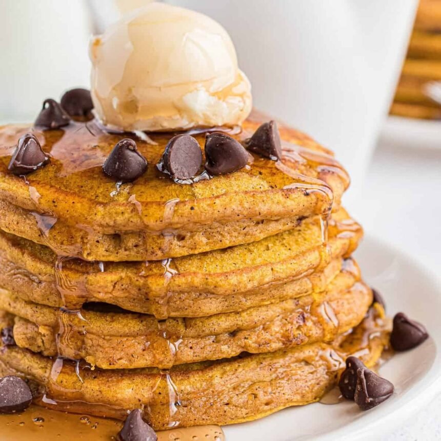 Jump to Recipe 5 from 1 rating 10 6 Panquecas de abóbora com pepitas de chocolate vão lembrá-lo daqueles enormes muffins de abóbora que pode encontrar em padarias especializadas no outono. Felizmente, pode desfrutar de panquecas de abóbora durante todo o ano!Há alguma melhor combinação de sabor para o clima…