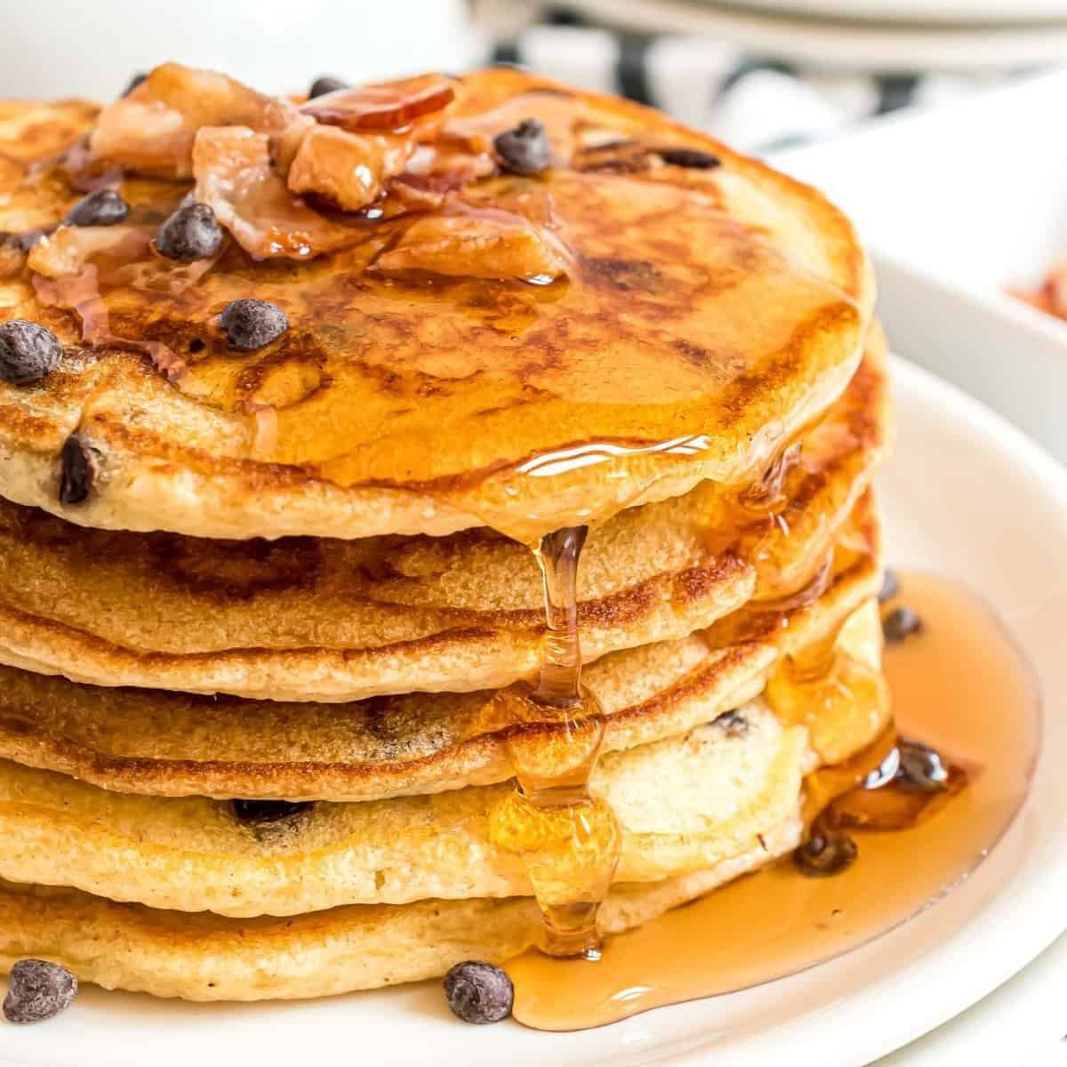 Ninguém consegue resistir a uma pilha de deliciosos panquecas fofas, cheias de bacon salgado e ricas gotas de chocolate! Cubra-as com pedaços extras de bacon, gotas de chocolate e um generoso toque de xarope de bordo e você estará no paraíso!