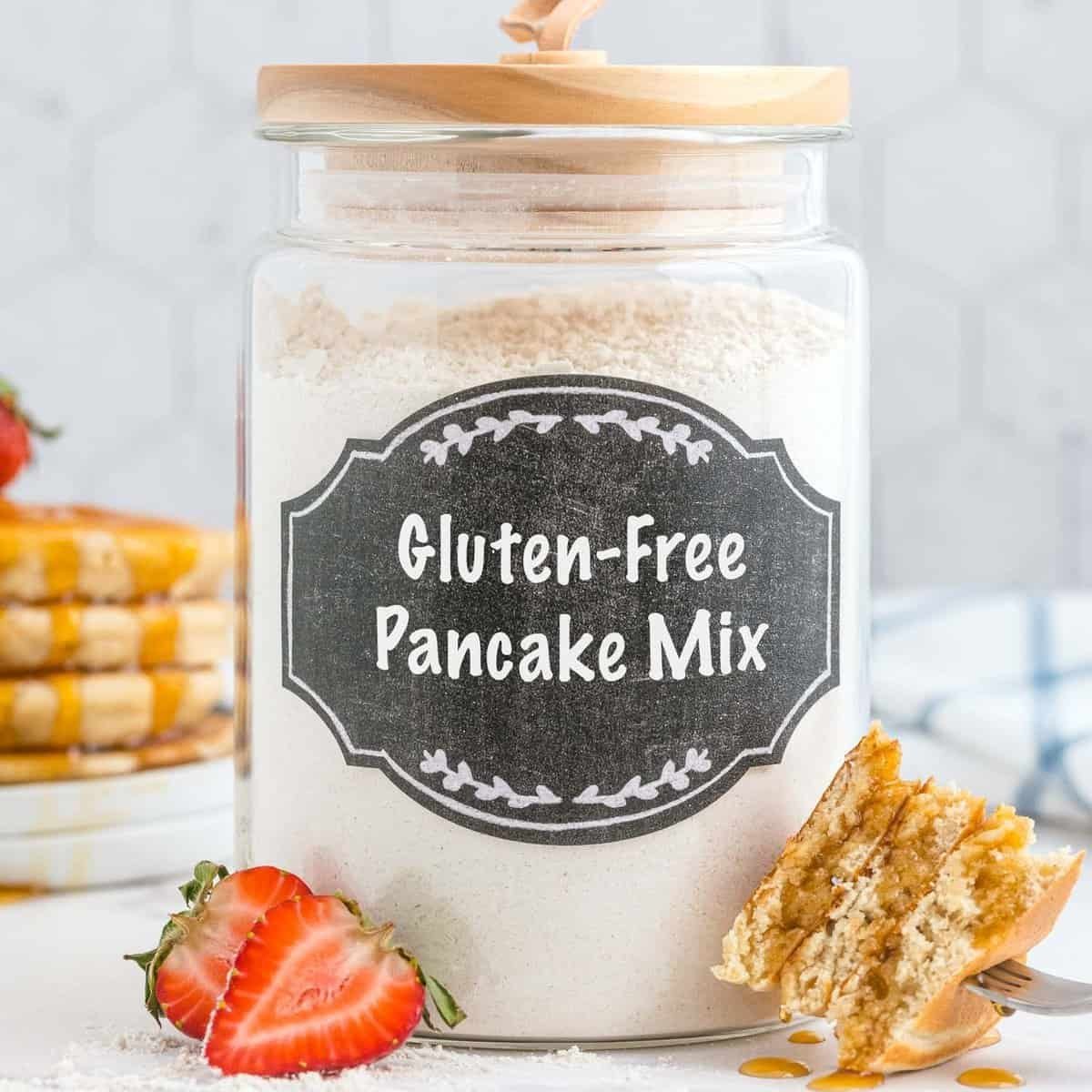 Jarra de vidro com rótulo preto escrito 'mistura de panqueca sem glúten'. Panquecas cortadas em primeiro plano.