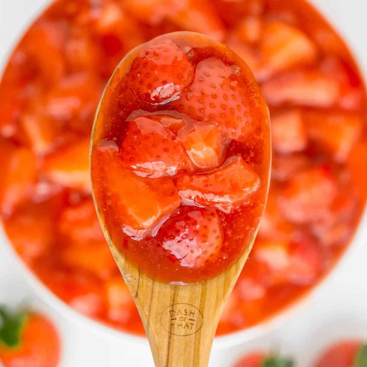 - Morangos – Frescos ou congelados funcionam bem, mas os cortados são melhores. Eu usei morangos inteiros para fazer este molho, e funciona bem, mas planeje cozinhar um pouco mais para permitir que os morangos inteiros se desfaçam um pouco e se transformem em um bom molho.