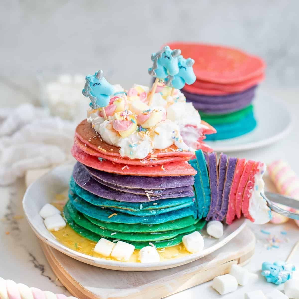As panquecas de unicórnio são perfeitas para um café da manhã de aniversário especial, ou para servir como café da manhã em uma festa do pijama. Combine-as com copos de mimosa mocktails ou leite de morango com borda de açúcar colorido ou confeitos arco-íris para tornar a refeição temática de unicórnio completa!